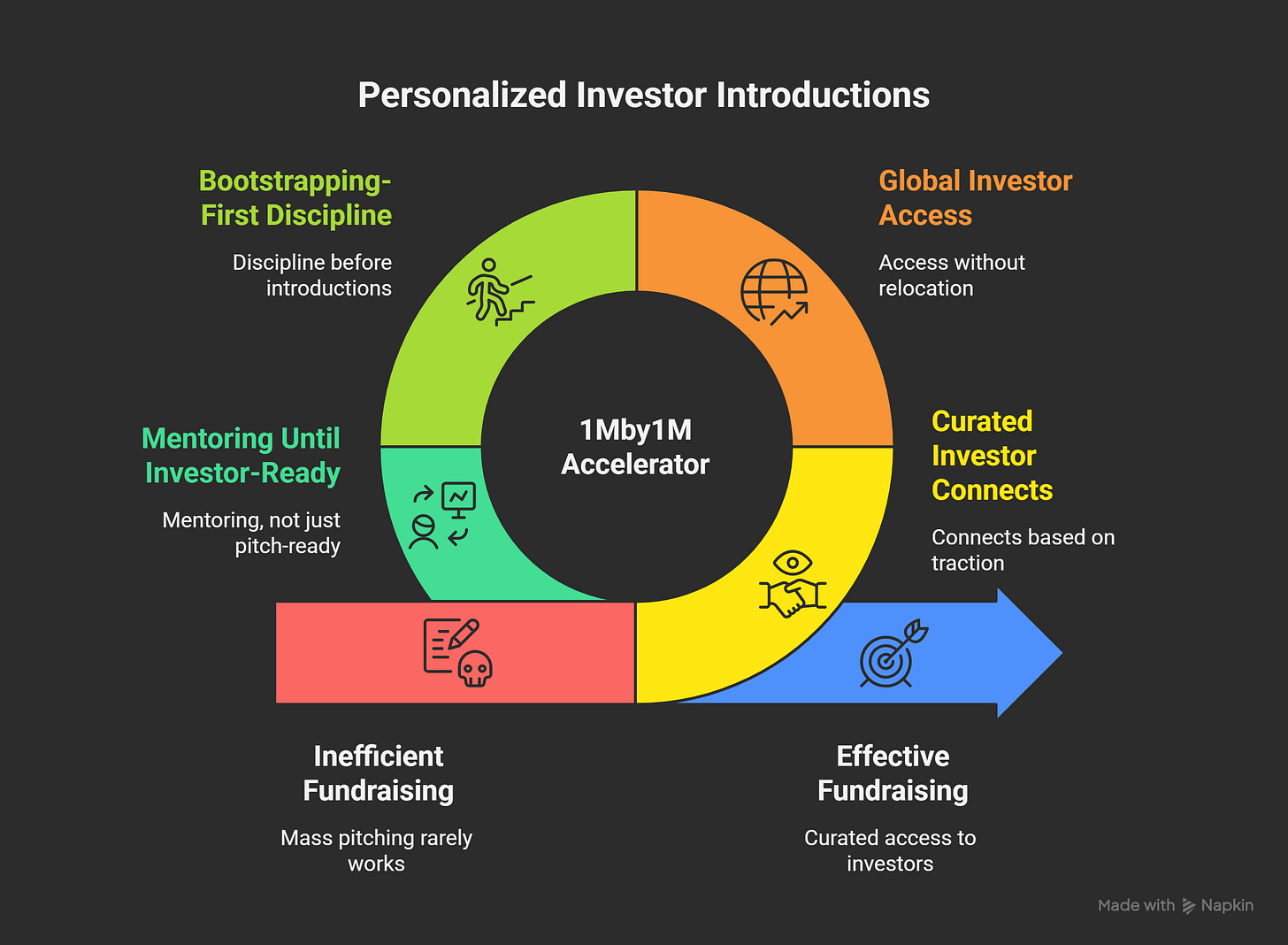 For many founders, fundraising feels like a numbers game: send 100 cold emails, pray 2–3 investors respond. 1Mby1M’s philosophy is to bootstrap first, raise money later or not at all. This makes 1Mby1M the only world class accelerator that doesn’t obsess about funding. However, they have a terrific investor network and facilitates plenty of fundraising rounds.
